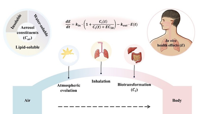 暴露于大气的气溶胶威胁着人类健康,在全球范围内仍未得到有效应对。气溶胶的毒性在很大程度上取决于化学和生物组分,它们在大气转化过程、人体吸入、分布、代谢和清除过程中的浓度和性质不断发生变化。尽管以往对气溶胶静态的组成及其毒性效应开展了大量深入的研究,但其动态变化以及从空气到人体的相关毒性效应仍不清楚。PM2.5的大气动力学已经相对成熟,但是其在体内演化机制的研究却面临多学科方法学上的挑战,限制了基于PM2.5理化性质对人体健康效应的预测与防护。近期,工口实验室 大气环境健康团队和公共卫生学院联合香港理工大学提出概念性的气溶胶毒性动力学框架,即,根据大气和体内不断演化的气溶胶组分和化学-转运-代谢等机制,推导出可在体内发挥生物效应的动力学方程,从而预测单组分或多组分混合物在体内的特定生物效应。研究成果发表于环境领域著名期刊Environmental Science & Technology,标题为“Aerosol Toxicokinetics: A Framework for Unraveling Toxicological Dynamics from Air to the Body”。