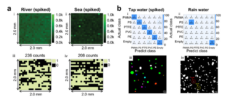 图2.机器学习辅助检测自来水和环境水样中的微塑料和纳米塑料。(a)加入河流和海水样品中的1 μm PS颗粒(100 μg/mL)的拉曼光谱映射(i、ii)和LR变换(iii、iv)。(b)混淆矩阵显示了加标自来水(i)和雨水(ii)选定区域的拉曼光谱分类结果,以及加标自来水(iii)和雨水(iv)中基于射频的颗粒识别结果。