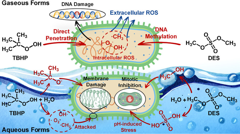 TBHP作为有机氧化剂,在气相和水相中表现出显著不同的毒性机制。水相中,TBHP更易电离产生OH·,并借助丰富的电子/质子转移通道增强自由基活性,因此水相TBHP诱导氧化应激能力更强。相比之下,气相TBHP尽管生成自由基的能力较弱,却诱导更强的遗传毒性。跨膜模拟显示,水相TBHP易转化为t-BuOH后穿膜,而气相TBHP可直接穿膜进入胞内,在细胞内再释放自由基,造成更直接的DNA损伤和胞内ROS积累。DES作为有机诱变剂,在气相和水相中也表现出显著不同的毒性机制。气态DES更稳定,保留完整烷基化分子结构,而水相DES则自发水解为甲醇和硫酸,导致烷基化潜能下降。因此,气态DES保留了更强的烷化剂特性,激活特有氧化应激通路,而水相DES则诱导额外的硫酸相关应激反应。在遗传毒性方面,气相和水相DES都能激活DNA甲基化修复通路,并进一步引发脱嘌呤、染色体碎片化及细胞分裂抑制。但气相DES的作用更强,其遗传毒性为水相的2.6倍,且诱导了更显著的DNA修复响应。
