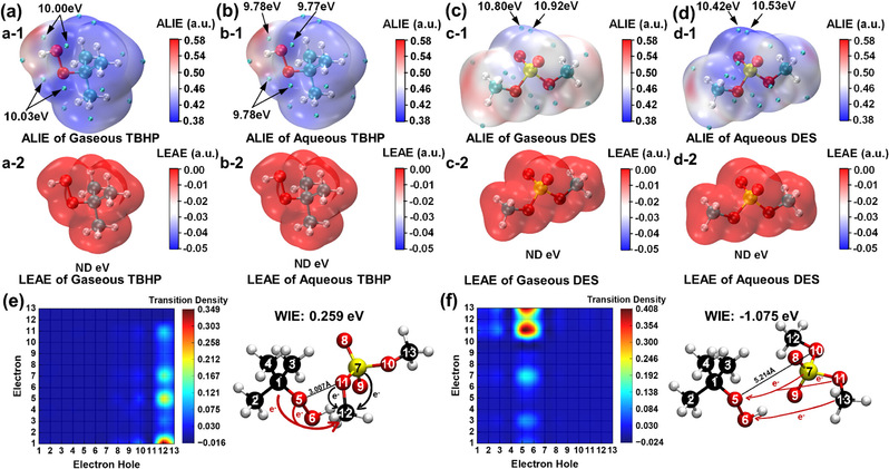 图3. TBHP、DES及其混合物在气相和水相中的计算化学分析。(a)气态TBHP、(b)TBHP溶液、(c)气态DES和(d)水相DES的平均局部电离能(ALIE)和局部电子附着能(LEAE)。(e)水相和(f)气相中混合物在最稳定相对三维位置下的电子跃迁和弱分子间相互作用能(WIE)的相应分子图。