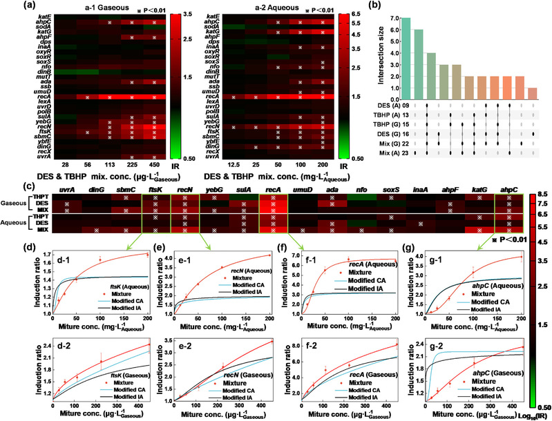 图2. TBHP和DES混合物在气相和水相中的遗传毒性。(a)DES和TBHP二元混合物在气相和水相中的遗传毒性热图。(b)DES、TBHP及其混合物在气相和水相中的UpsetR图,统计样本量:104。(c)DES、TBHP及其混合物对特定基因通路的最大诱导速率热图。混合物对三条重要基因通路(包括(d)ftsK、(e)recN、(f)recA和(g)ahpC)的浓度-诱导速率曲线、改进的CA和IA模型预测曲线。