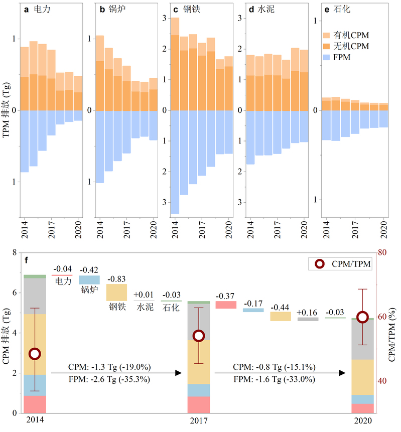 图1:2014–2020年期间我国固定燃烧源排放的一次颗粒物质量变化。(a–e) 电力、工业锅炉、钢铁、水泥以及石化部门排放的可凝结颗粒物(CPM),包括有机以及无机组分以及可过滤颗粒物(FPM)变化;(f) CPM排放量变化的来源贡献以及CPM在TPM中占比变化