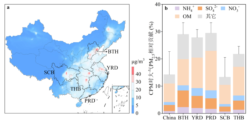 图2:2019年1月我国固定源排放可凝结颗粒物(CPM)对大气PM2.5贡献。(a) CPM排放贡献的PM2.5浓度分布;(b) 重点区域CPM排放对PM2.5浓度贡献率,涵盖京津冀(BTH)、长三角(YRD)、珠三角(PRD)、川渝盆地(SCB)及两湖盆地(THB)。CPM组分包括铵盐(NH4+)、硫酸盐(SO42-)、硝酸盐(NO3-)、有机物(OM)及其他组分(其它)