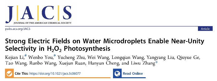 近日,工口实验室 张立武课题组在化学反应选择性调控领域取得重要进展。该团队的研究表明,水微滴的气-液界面所固有的强电场能够作为一种有效的外部控制参数,精准引导化学反应的路径,从而解决合成化学中的选择性难题。该成果近日以“Strong Electric Fields on Water Microdroplets Enable Near-Unity Selectivity in H₂O₂ Photosynthesis”为题发表于《美国化学会志》(Journal of the American Chemical Society)。