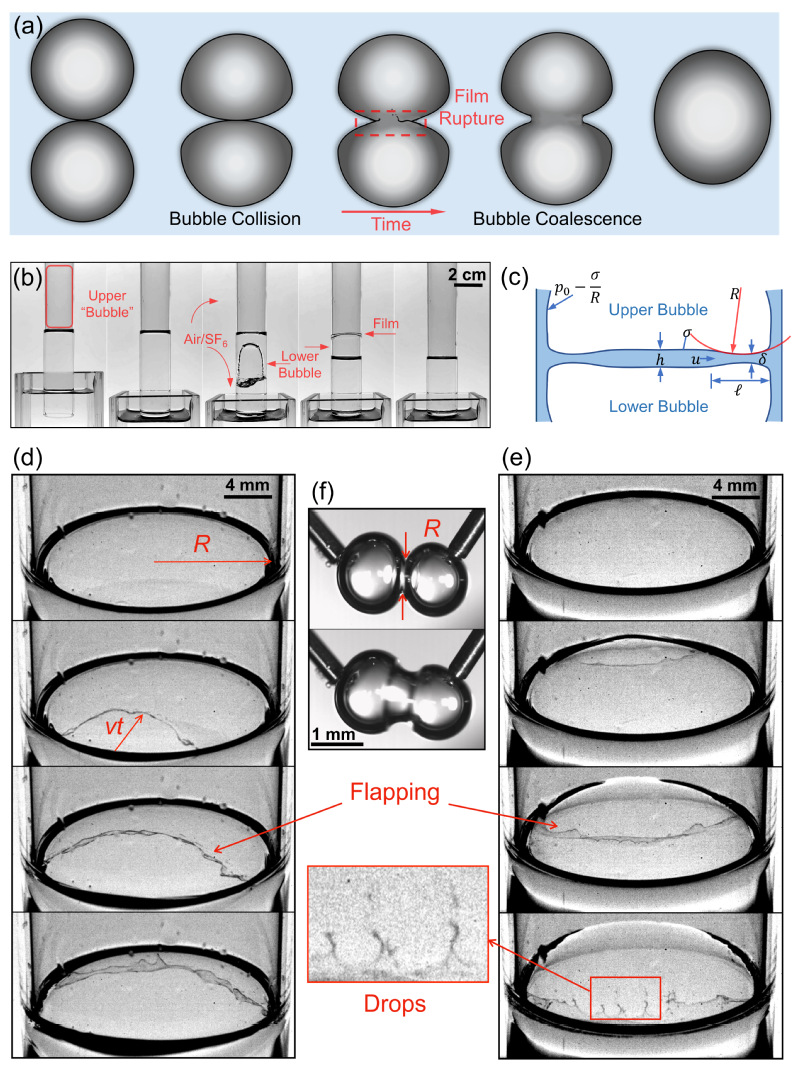 图3. 气泡碰撞时的薄膜破裂与液滴产生。(a) 气泡碰撞凝并的示意图;(b) 气泡碰撞模拟实验示意图;(c) 碰撞挤压时膜排水的参数示意图;(d) 空气中水膜破裂的照片;(e) SF6中水膜破裂的照片;(f) 气泡碰撞时膜破裂前后的照片。