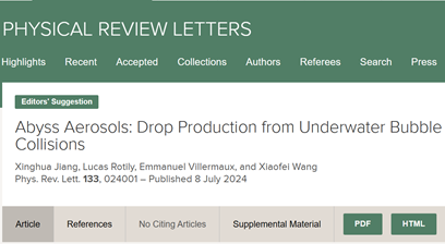 近日,我系王笑非研究员课题组与法国艾克斯-马赛大学Emmanuel Villermaux教授团队合作在物理评论快报(Physical Review Letters)上发表了题为“Abyss Aerosols: Drop Production from Underwater Bubble Collisions”的论文。该论文首次揭示了气泡在水下碰撞产生大量亚微米级液滴的新机理。这一发现为水气界面物质交互提供了全新的视角,并为准确预测海洋飞沫气溶胶的产生通量及其环境效应提供了理论基础。
