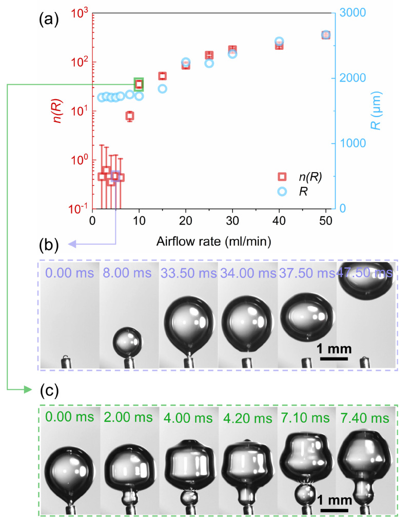 图1. 液滴产生量的骤增及气泡碰撞的发现。(a)产生气泡的气流速率与亚微米液滴产生速率、气泡曲率半径的关系; (b,c) 阈值前后水下气泡碰撞现象的照片。