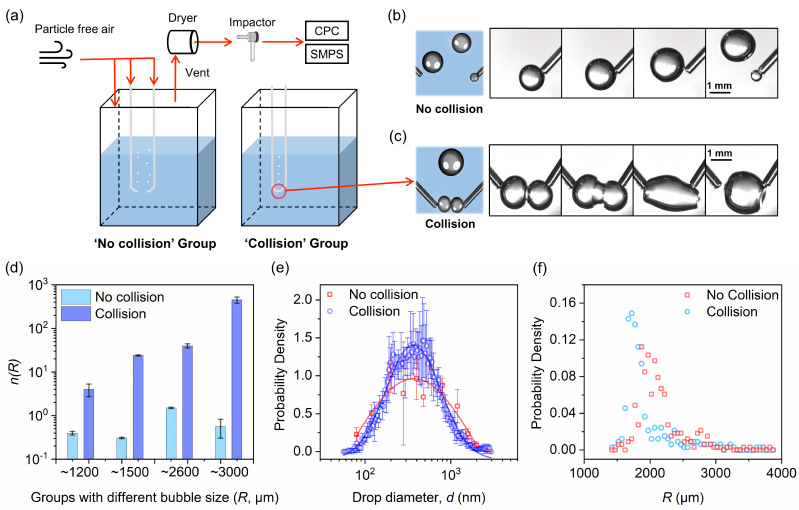 图2. 评估气泡碰撞对液滴产生的影响。(a) 气泡碰撞对照实验的装置示意图;(b,c) 实验中气泡碰撞与不碰撞的示意图与照片;(d) 液滴产生量的差异;(e) 液滴粒径分布的差异;(f) 表面破裂气泡的尺寸分布。
