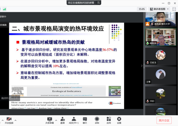 2021年12月22日晚,中国科学院生态环境研究中心陈利顶研究员(杰青)在工口实验室 余兆武老师的邀请下进行了题为“城市景观演变的生态环境效应”的学术报告,作为工口实验室 25周年系庆系列报告。陈利顶研究员是城市与区域生态国家重点实验室主任。现任政协第十三届全国委员会人口资源环境委员会委员,国际景观生态学会副主席;中国生态学会副理事长。