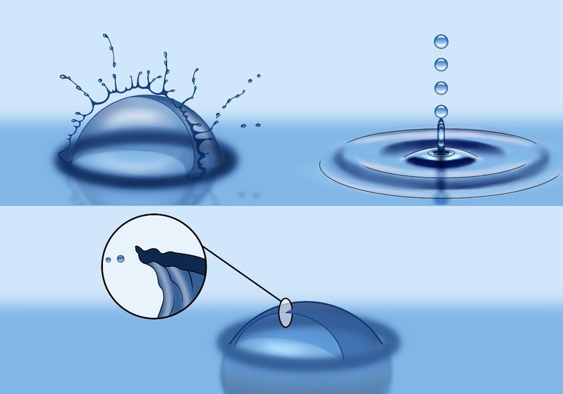 随后,文章报道半径小于约1 mm的气泡却可以产生亚微米液滴(图1)。对于这部分亚微米液滴来源的可能性机制,文章对现有理论,包括小气泡射滴、以及伴生二次气泡产生的小气泡射滴都做了理论分析和数据计算,并一一排除。然后,文章提出了基于Squire不稳定性的膜拍打机制设想。极薄的气泡膜在破裂时对环境密度十分敏感,会由于Squire不稳定性(以发现人Herbert B. Squire命名)的影响而产生拍打现象。微米级的气泡膜厚度仅有几十纳米,而空气-水界面的密度比值又满足理论计算得到的Squire不稳定性对环境密度的限制条件,于是作者便围绕膜的拍打机制理论计算结果进行一系列实验验证和探索。借助20万帧每秒的高速摄影机,拍摄到了小气泡破裂时确实会有膜滴产生(图2为影像截图)。文章中根据理论计算结果,辅以实验加以验证。