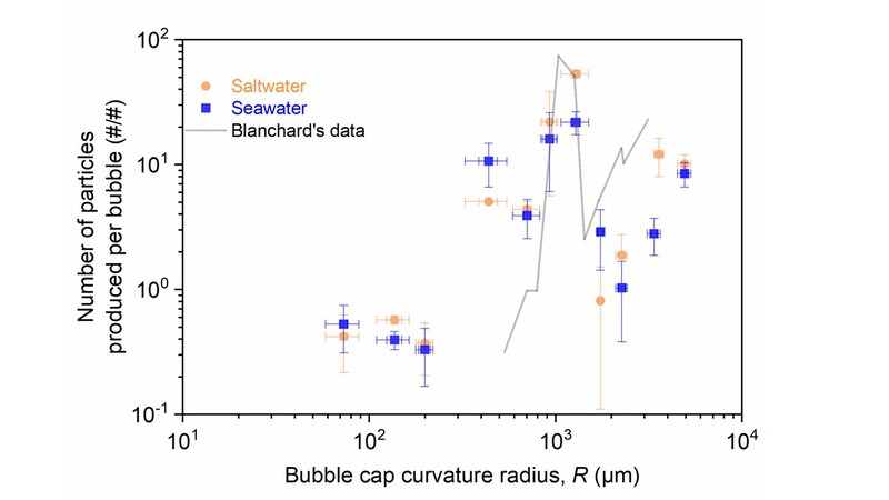 海洋飞沫气溶胶(又称海盐气溶胶)是大气气溶胶的主要来源之一,是水气界面传输水分、盐分、有机物、微生物的重要载体,对气候环境、大气化学和人体健康等都有着极其重要的影响。其中,气泡破裂是主要的海盐气溶胶产生途径,分别通过两种方式产生气溶胶:一是气泡膜在受到瑞利泰勒不稳定性(Rayleigh-Taylor instability)和向心加速度的影响下破裂,产生的液滴称为膜滴;二是气泡破裂后空腔崩塌产生的沃辛顿射流(Worthington jet)裂解,产生的被称为射滴。