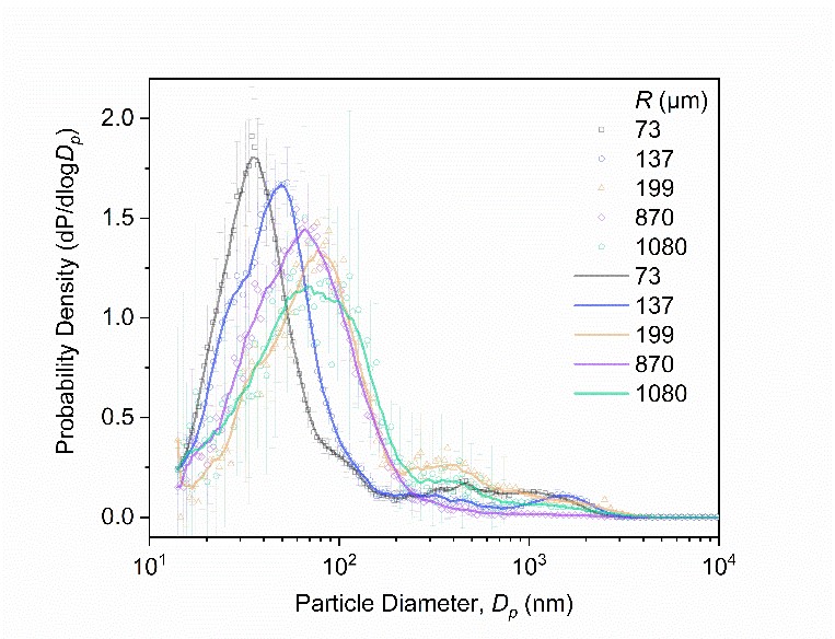 图1 五种不同半径气泡在盐水破裂产生的颗粒粒径分布概率密度函数
