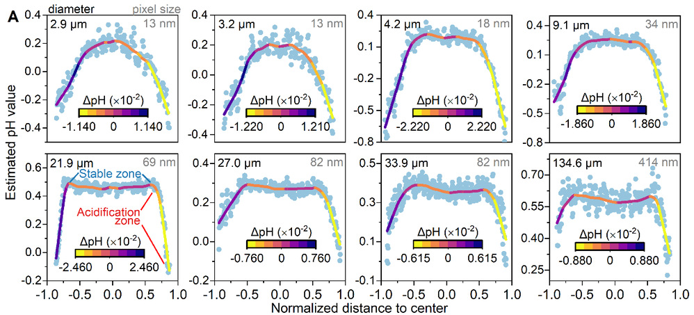 通过对多个不同尺寸的微滴气溶胶的测量,研究人员发现气溶胶内部的pH值分布受到其尺寸的影响。微滴的尺寸越小,其界面pH值越低,pH值变化的程度和区域越大,pH值从中心到边缘单调下降。而随着直径的增加,“pH稳定区”开始出现在微液滴的中心区域,在气溶胶边缘的内侧而非中心观察到最高的pH值。通过模拟计算表明,该结果可能受到界面电场的影响。(图3)
