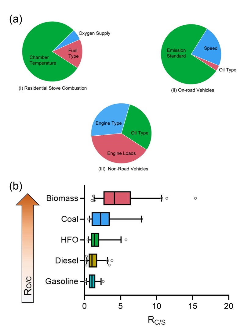 通过控制燃烧实验和优势分析模型的结合,揭示了Char和Soot在前体和副产物方面的差异。首先,与Soot相比,Char可能是由分子量更高的有机挥发物前体形成的。其次,在Char和Soot形成途径之间会产生不同的副产品或中间产物。优势分析结果证明炉温是固体燃料(RBB 和 RCC)低温燃烧的最显着影响因素,解释了 79% 的 RC/S变化,其次是燃料成分 (18%)。对于发动机技术相对较差的非道路源尾气,燃油质量和排放标准,发动机参数(负载和功率)和机油成分解释了70%和30%的RC/S变化分别。相比之下,对于具有更先进燃烧技术和更严格排放标准(如OVE)的源,排放标准或后处理技术解释了75%的RC/S变化,这掩盖了燃料成分以及Char和Soot形成途径的影响差异。
