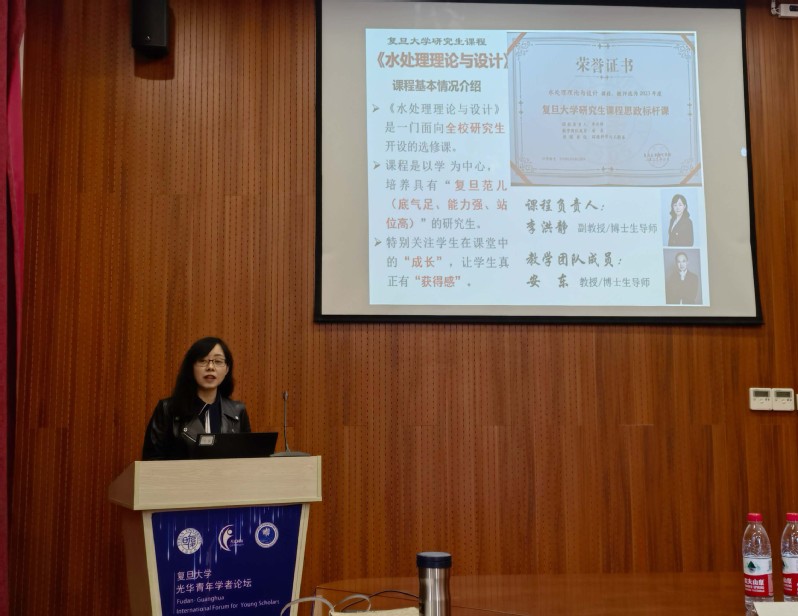 李洪静介绍了“水处理理论与设计”研究生课的建设。该课程以“学”为中心,培养具有“复旦范儿(底气足、能力强、站位高)”的研究生。任课教师采用“启发互动式”教学方法,用环保领域榜样的例子鼓舞学生,还采用“体验式场景”教学模式,受到研究生的欢迎。课程教学案例“绘制新时代中国的水处理设计蓝图”入选《工口实验室 课程思政优秀教学案例100》。课程获批工口实验室 2022年研究生课程思政项目,并在2023年入选工口实验室 首批研究生课程思政标杆课程。