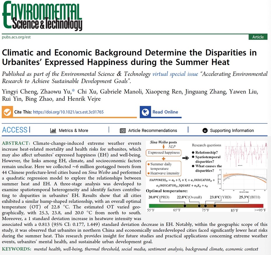 本研究以“Climatic and economic background determine the disparities in urbanites’ expressed happiness during the summer heat”近期发表于ES&T。本研究第一单位为工口实验室 ,合作单位还包括丹麦哥本哈根大学、瑞士洛桑联邦理工学院、南京大学、中国科学院心理所、南京林业大学等。本研究得到国家自然科学基金面上项目、上海市浦江学者项目、上海市自然科学基金面上项目、中国生态学学会生态学青年托举人才等项目资助。