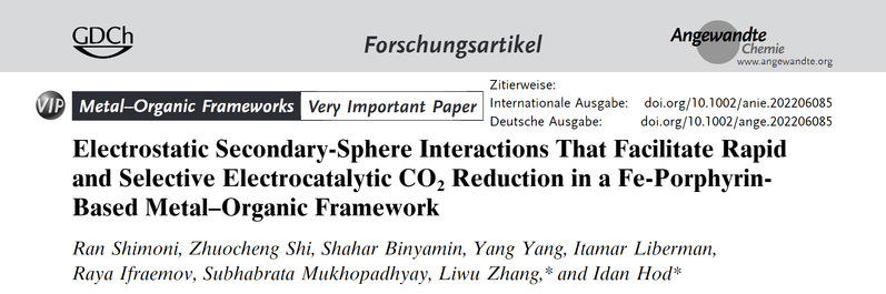 近期,工口实验室 张立武课题组与以色列本古里安大学IdanHod课题组合作开展了通过调节靠近催化活性位点的静电相互作用来促进电化学CO2还原效率和选择性。探索了基于铁卟啉(Hemin)改性的Zr-BTB,通过连接一个阳离子官能团(3-羧丙基)三甲基铵(TMA)到铁卟啉活性位点附近来调节静电相互作用。发现TMA在催化过程中对表面结合的CO中间体施加了静电稳定作用,从而大大提高了CO2到CO的转化率和选择性。通过改变TMA的表面密度和电解质的离子强度,进而改变静电相互作用的程度。以上设计系统地调整了电催化选择性,几乎达到了100%的CO2转化为CO。
